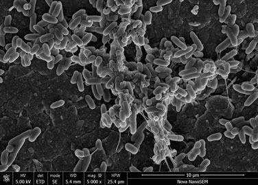 Pseudomonas aeruginosa by scanning electron microscopy. (Image courtesy of Xenia Kostoulias, Monash University, Australia) | |