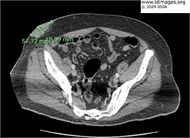 - Figure 2: CT abdomen showed a 4.8 x 2.0 cm soft tissue mass in the right lower abdominal subcutaneous fat abutting the skin.