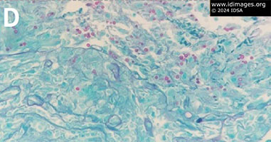 Dermatology biopsied two nodules from patient’s chest, which were sent for both culture, pathology, molecular testing, and polymerase chain reaction sequencing. The pathology of the skin biopsy showed small intracellular and extracellular organisms, which stained positive on Grocott–Gömöri's methenamine silver stain and Periodic acid–Schiff–diastase (Image 3 & 4).