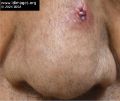 - Image 2: Lesion on nose of patient, stage prior to eschar formation